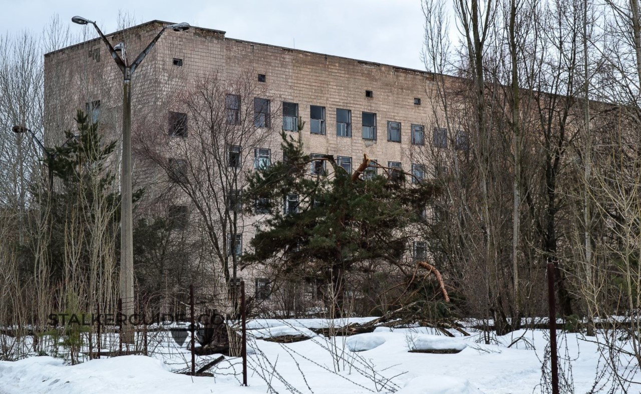 Припятская больница и поликлиника. Здание делится на три части: поликлиника, стационар, детское отделение. В отдельных строениях располагались неврологическое,инфекционное, родильное отделения и, конечно же, морг.