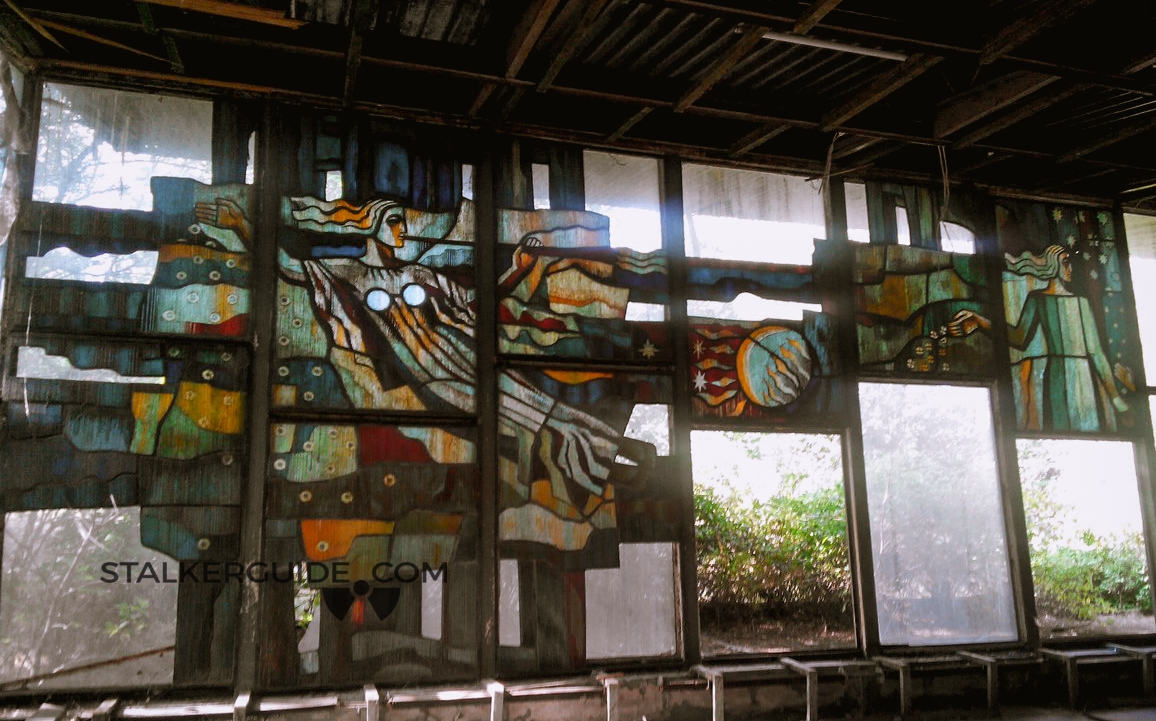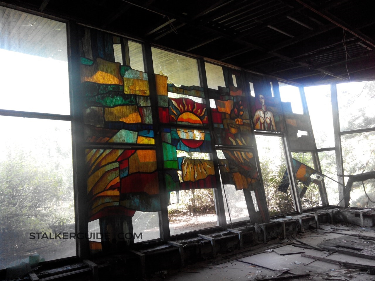Осмотр вокзала не занимает много времени и можно перебраться к кафе «Припять». Пожалуй все кого я знаю находят это место очень умиротворённым и спокойным, из за воды? Витражи всё больше разрушаются, и даже металлическую вывеску не так давно покорёжила рука вандала, но кафе на пристани всё равно остаётся одним из приятнейших мест города Припяти. Выйдя во дворик, даже не глядя на буйные заросли догадываешься, как красиво здесь было до аварии. Впрочем, даже растительность здесь привносит свой шарм, спустившись по ступенькам под нависшими ветками, можно попасть на пристань, а там, самое место полюбоваться на Яновский затон, и если повезёт, понаблюдать белых лебедей плавающих по водной глади.