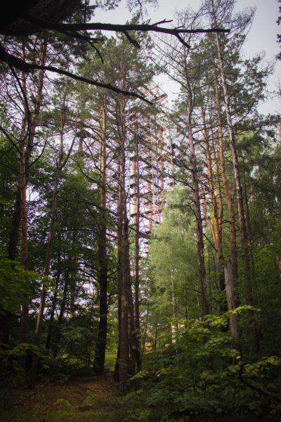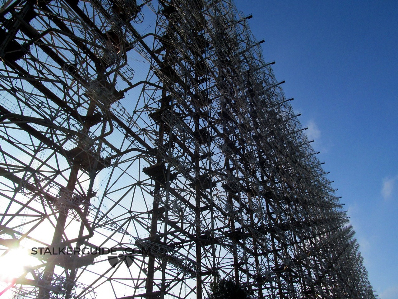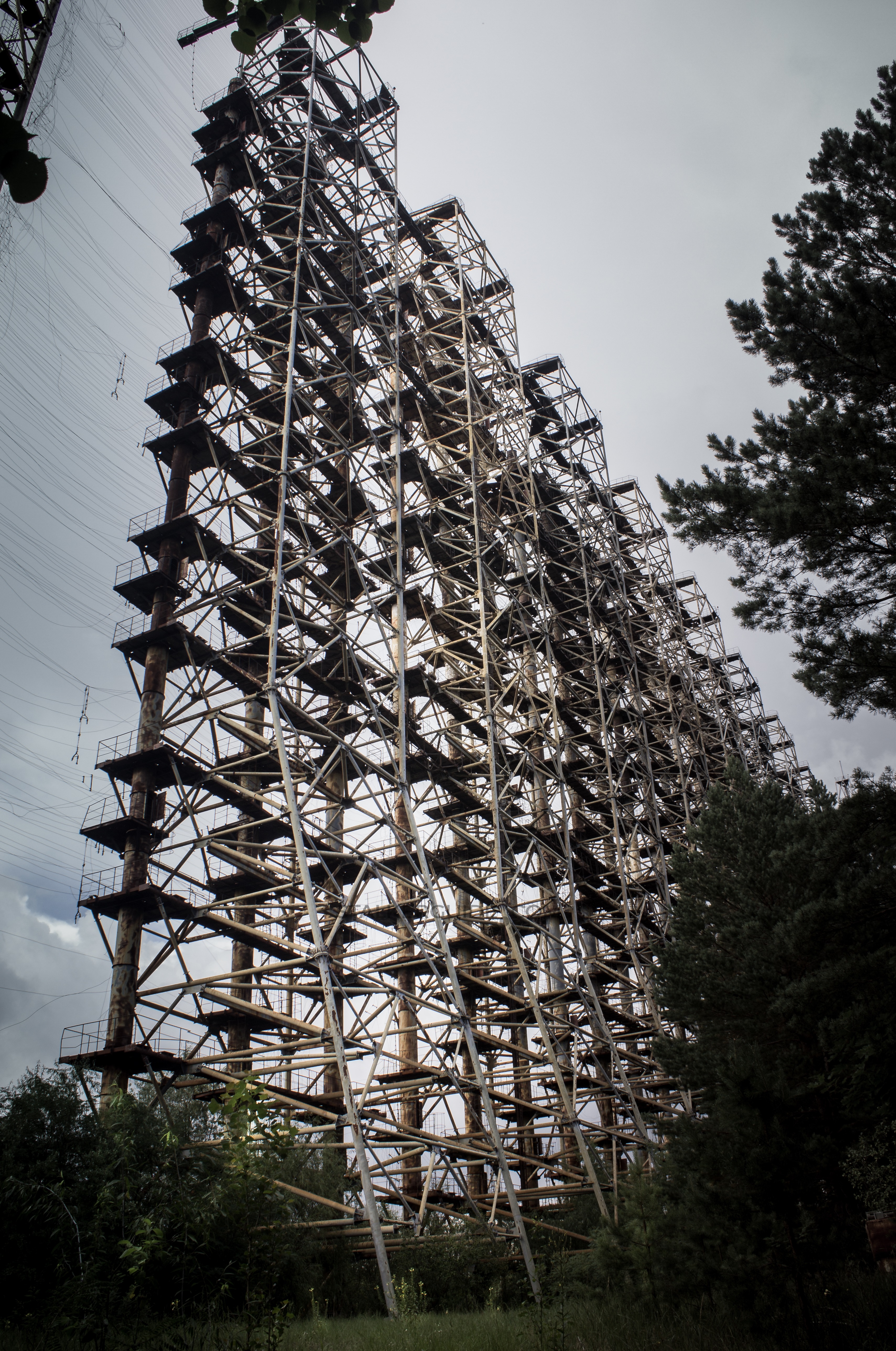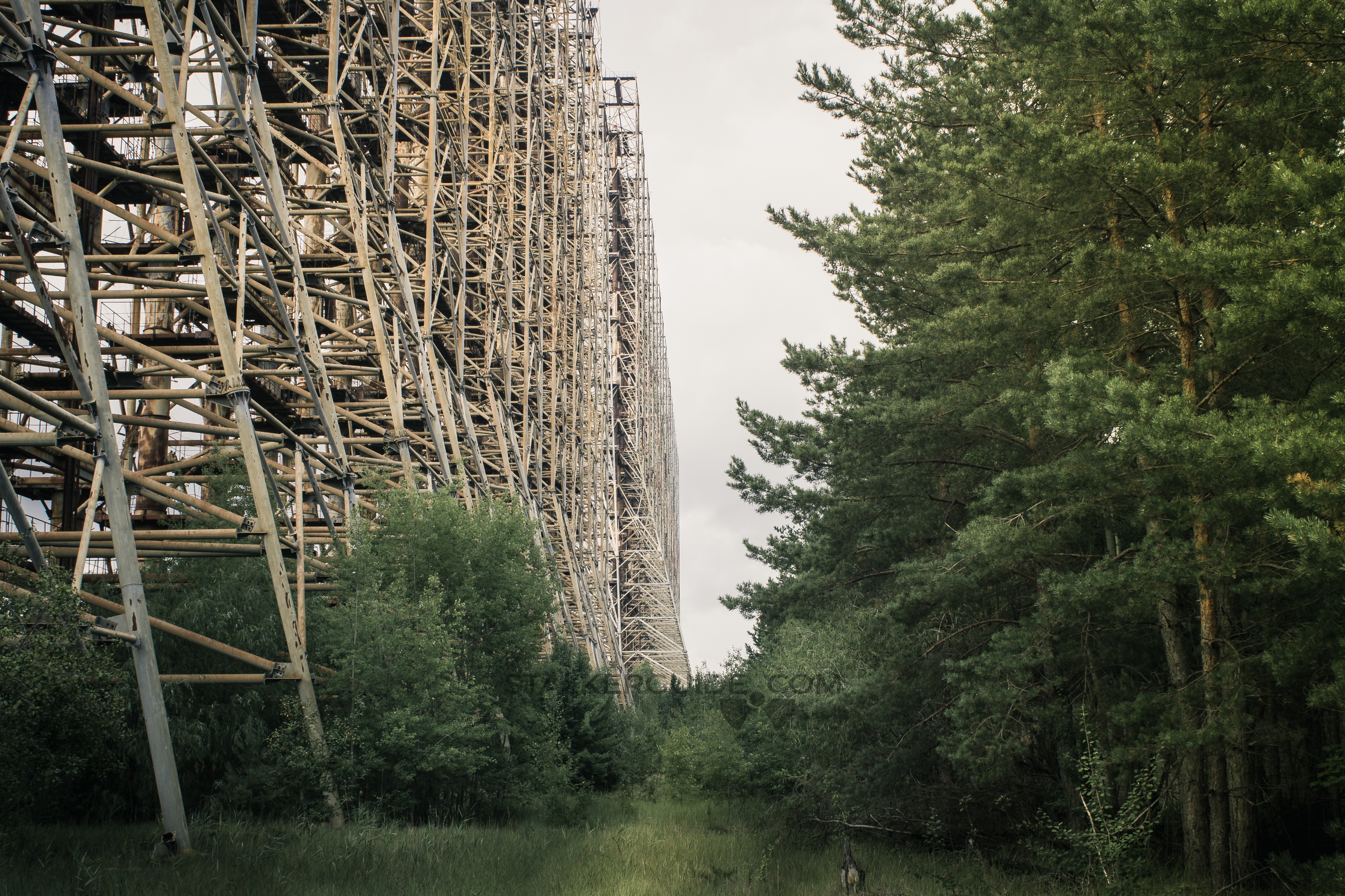 «Дуга» — один из объектов наследия холодной войны. До аварии на ЧАЭС это место считалось секретным и на картах обозначалось малозаметной надписью «пионерлаг.». Пионералагеря, конечно, не было, зато был целый городок под названием «Чернобыль-2» в котором жил обслуживающий «Дугу» персонал и их семьи. Чернобыль-2 тоже не был отмечен на картах, но о том что здесь никак не пионерлагерь, жители могли догадываться глядя на пейзаж. Почему? Да потому что в высоту ЗГРЛС (загоризонтная радиолокационная станция) была около 150 метров. Такую исполинскую конструкцию видно практически с любой точки зоны отчуждения. Главное предназначении ЗГРЛС — обнаружение межконтинентальных баллистических ракет на дистанции от 900 до 3000 км.